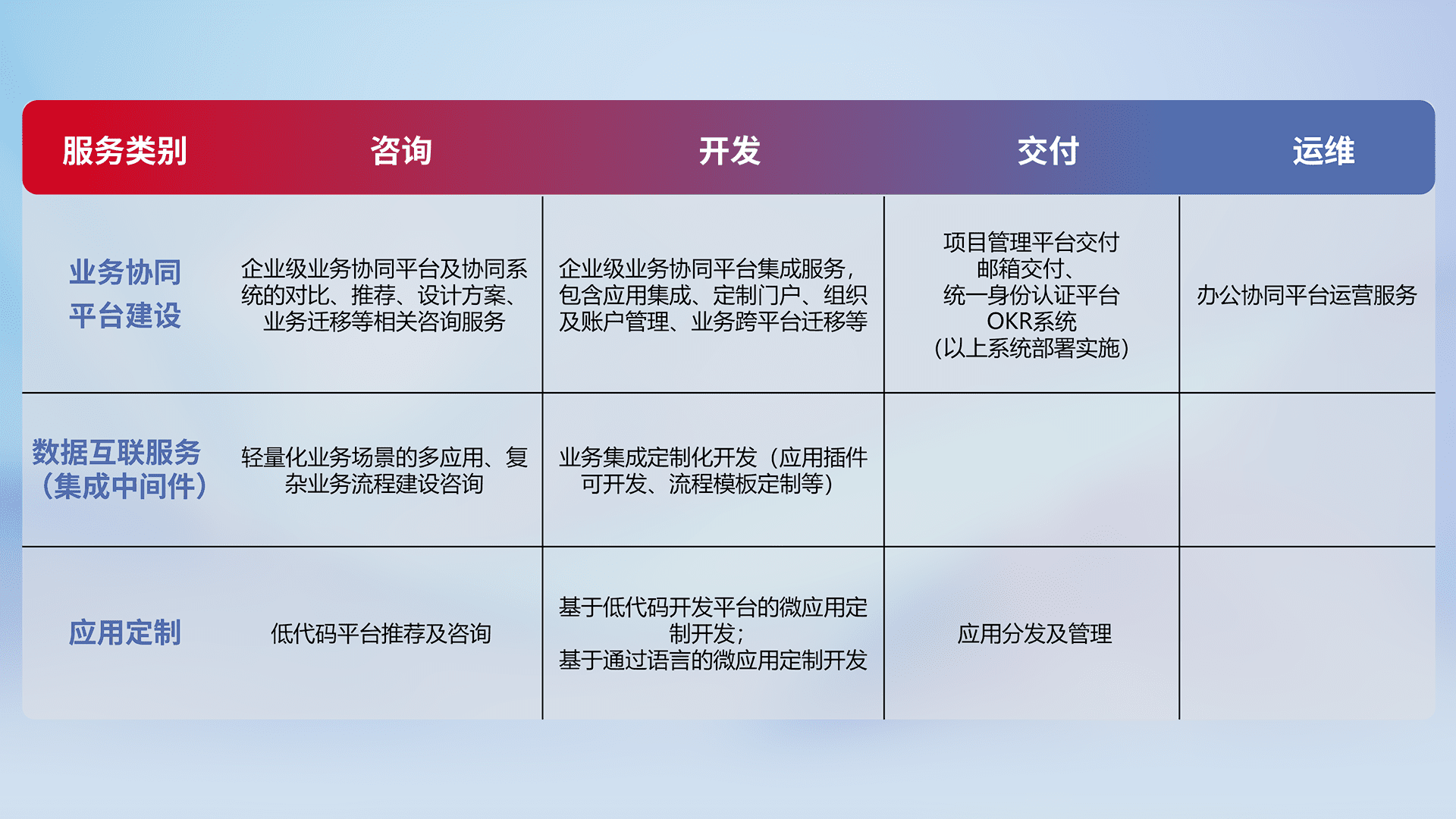 针对钉钉、、、、企微、、IDaas等平台级产品提供产品的规划、、方案、、、、交付、、、定制化开发等服务,,,,实现如统一协同办公、、智能客户服务、、混合会议管理、、智能数据查询、、等业务场景,,,,实现数字化转型。。。。