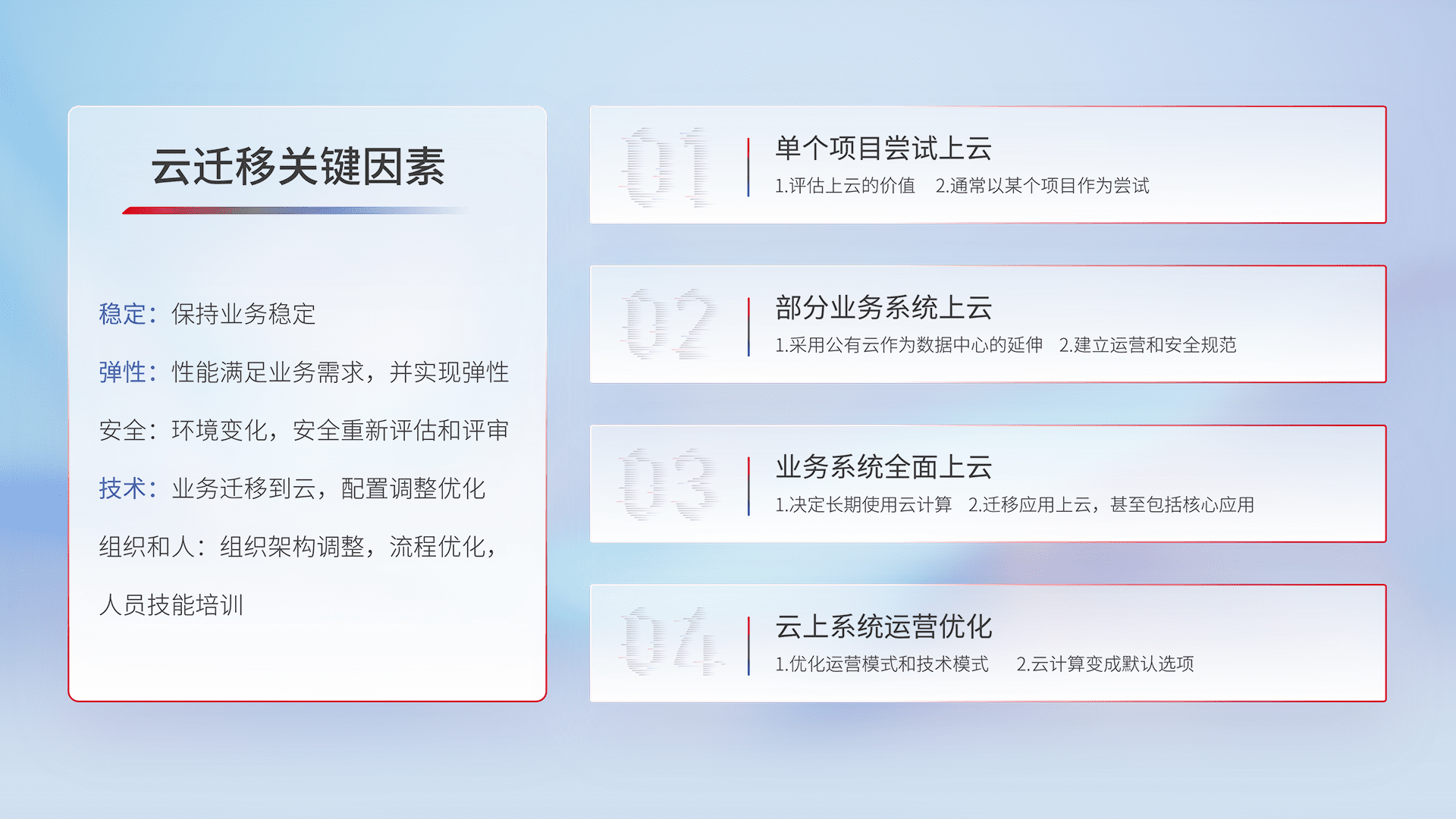 结合实际业务,,从规划设计、、、云平台选型、、云原生改造、、、数据迁移、、、集成交付,,,,迁移全过程为客户识别最佳上云路径,,做好风险识别管理,,,设计网络架构、、、身份权限、、、、安全审计合规、、、、操作审计、、、日志审计、、监控告警策略、、、、多站点容灾设计等,,,对云上基础设施进行整体规划,,提升IT治理水平,,,,以满足弹性、、高可用、、高性能的需求。。。。