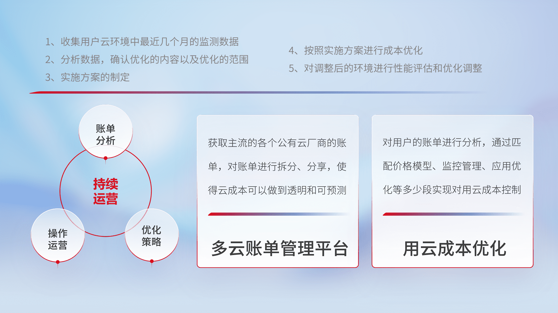 通过多云纳管,,,以统一的资源数据模型把客户的云资源进行抽象和封装,,,,进而实现对多云资源的统一操作,,,保障云资源管理的可靠性、、稳定性与可用性。。。。量身定制化运维内容,,,配置、、、、开发运维、、、、补丁管理、、、、备份、、、、监控、、、认证和访问管理、、、、审计和日常巡检等,,,保障在用云过程中的可靠度,,稳定度以及高可用率。。。。